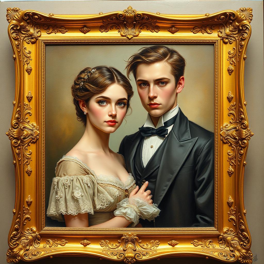 Elegance and Romance: A Victorian Love Story Prompt:Young beautiful Victorian couple in golden frame. Oil painting style COPY PROMPT